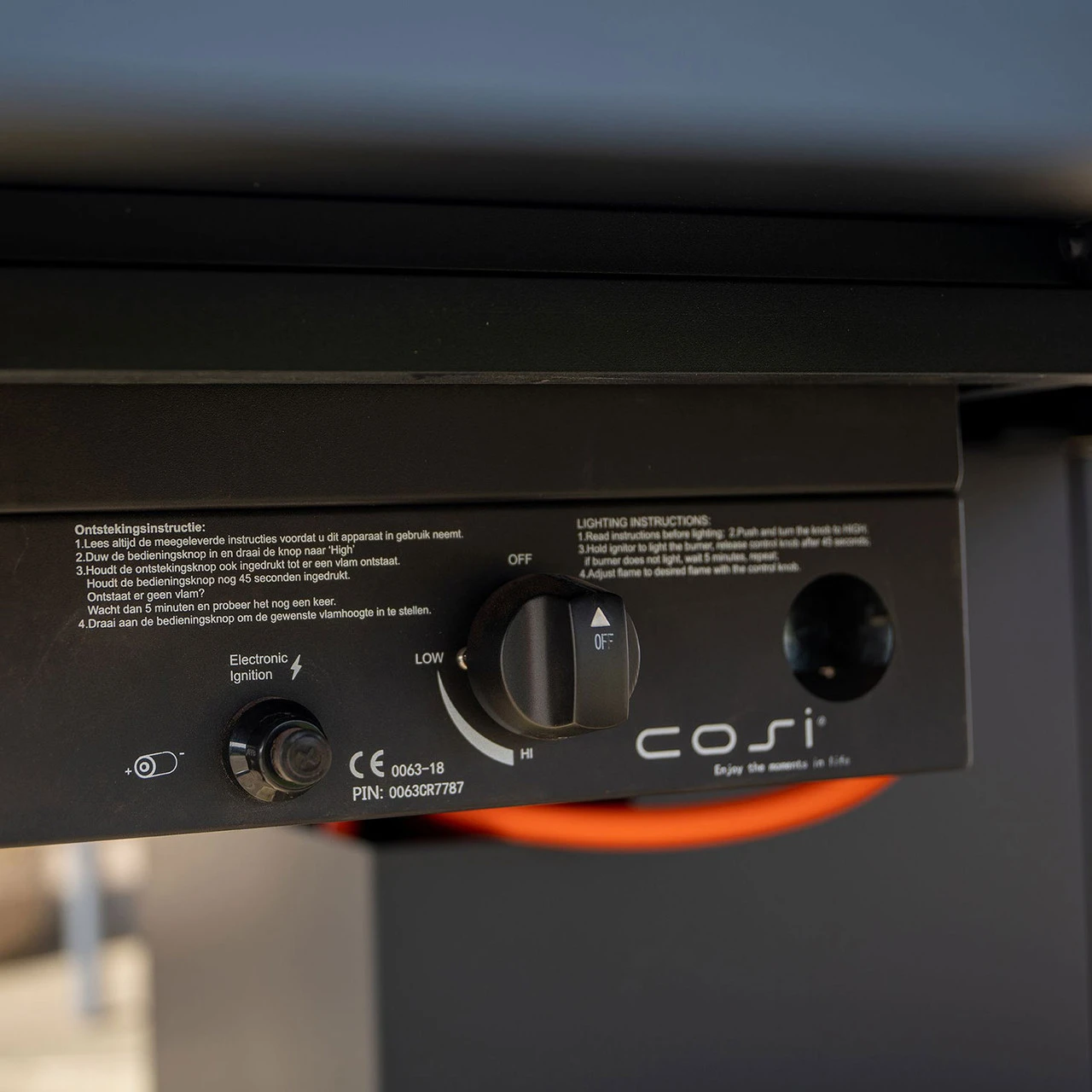 The Cosiloft Black Fire Table with grey aluminium top combined the Cosi Fire Pit with a square coffee table surround. It has an easy to use, electronic ignition that works on a battery. There is space for up to a 5KG gas bottle, which can be placed in a hidden compartment in the coffee table to ensure you have a stylish source well into the night.
